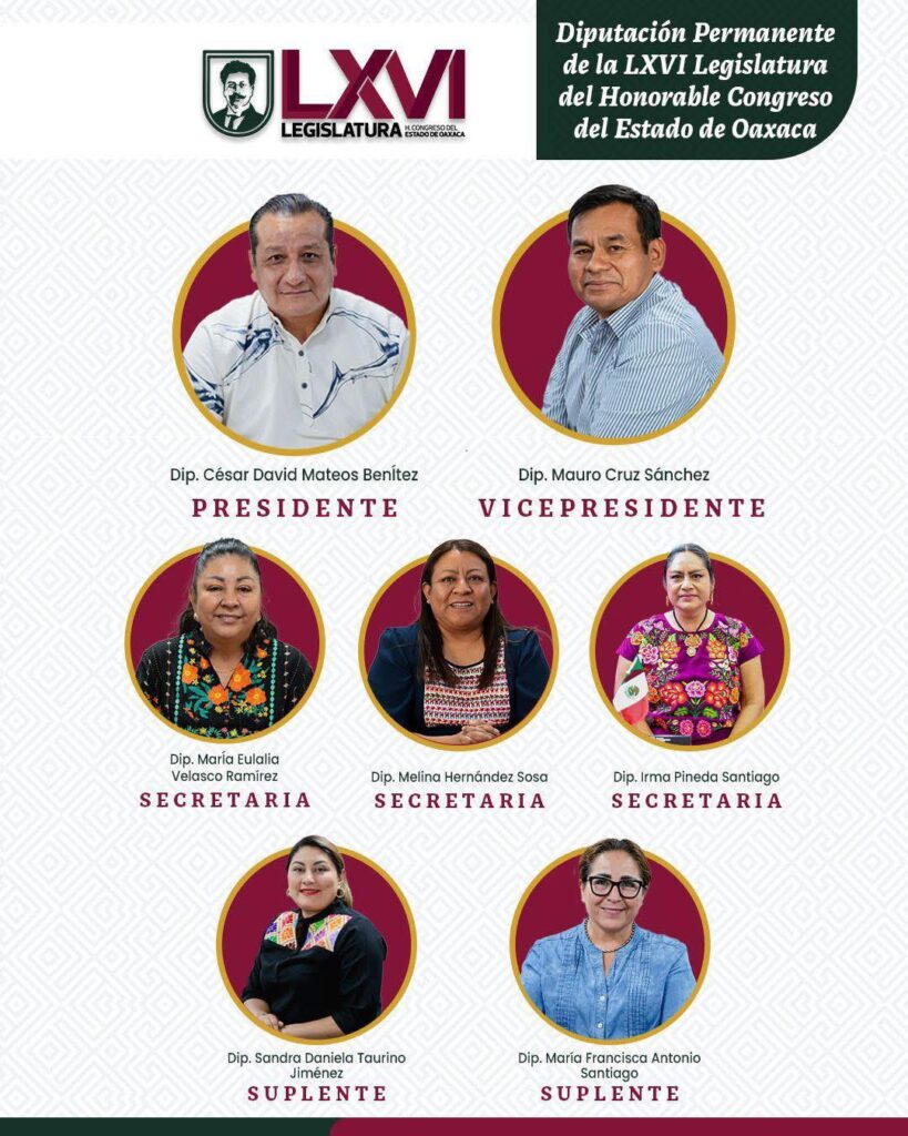 Y fungirán como Secretarias, las diputadas María Eulalia Velasco Ramírez de Fuerza por Oaxaca; Melina Hernández Sosa del Partido Verde Ecologista de México (PVEM) e Irma Pineda Santiago del Partido del Trabajo (PT).