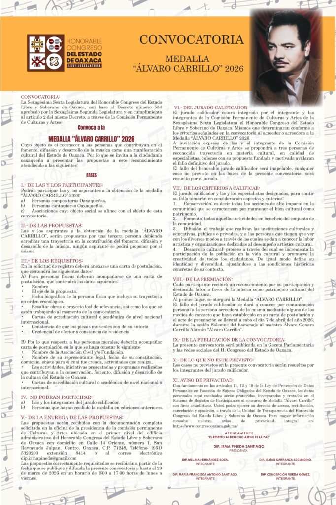 San Raymundo Jalpan, Oax., 13 de febrero de 2026.- La LXVI Legislatura del Congreso del Estado emitió la convocatoria para participar en el proceso de postulación a la Medalla “Álvaro Carrillo” 2026, con el objetivo de reconocer a quienes, por su trayectoria y aportaciones, han fortalecido la música como una manifestación cultural de identidad y patrimonio del pueblo oaxaqueño.